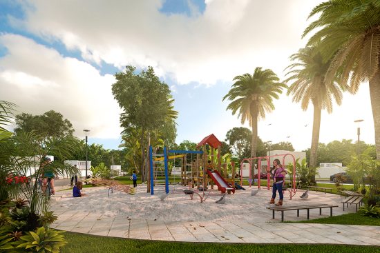 Juegos infantiles y una Casa Club se proponen como espacios comunes para la recreación y convivencia de los habitantes de este espacio que también propone una arquitectura en comunión con el medio ambiente.